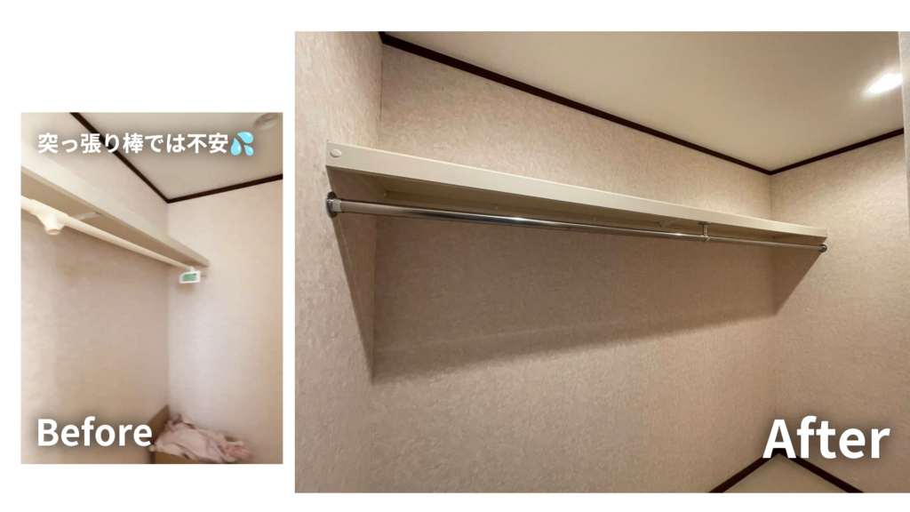 メッセージ:ハンガーパイプは適切な位置にしっかり取り付ければ、収納力が増し、使い勝手も大きく向上します。ところが自分で取り付けようとすると、水平がずれたり壁に固定できなかったりと、思っていた以上に難しい作業というのが分かります。場合によっては衣類の落下や壁の破損につながることもあります。